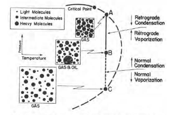 توجد بعض مخاليط الهيدروكربونات بشكل طبيعي فوق درجة حرارتها الحرجة مثل مكثفات الغاز. عندما ينخفض الضغط على هذه الخلائط، فبدلاً من التمدد (إذا كانت غازية) أو التبخر (إذا كانت سائلة) كما هو متوقع، فإنها تميل إلى التكاثف. وعلى العكس من ذلك، عند زيادة الضغط، فإنها تتبخر بدلاً من أن تتكثف. يتم توضيح العملية من خلال حالة درجة الحرارة Tr3 في الشكل اللاحق، ومنحنى تكاثف الغاز في الشكل التالي. تحدث هذه العملية بسبب قوى تؤثر على جزيئات ذات أحجام مختلفة وتعتمد على توازن هذه القوى، كما هو موضح في الشكل.